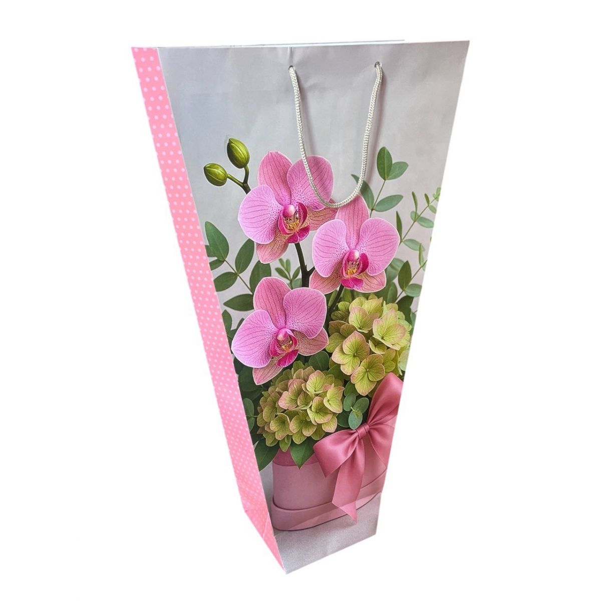 Подарункові пакети під орхідеї ідеально підходять для будь-яких горщикових рослин та квітів. Основне їх призначення це транспортування та презентація кінцевому адресату. Орхідея або будь яка висока квітка або рослина поміщена у подарунковий пакет - набуває гарного вигляду завдяки його вишуканим дизайнам. Дарувати горщикові рослини у звичайній прозорій плівці вже давно не актуально, тому ми й прийшли до такого цікавого та водночас не стандартного рішення. Форма та розмір подарункового пакету ідеально підходить для всіх типів стандартних горщиків та розрахована на середню висоту орхідей, так як мають висоту 60 см включно з ручками. На даній сторінці Ви знайдете близько 10 різноманітних вишуканих дизайнів нашого власного виробництва. Будь-ласка гортайте нижче та обирайте ті, що Вам до душі, адже кожен знайде близький варіант для себе або свого бізнесу.